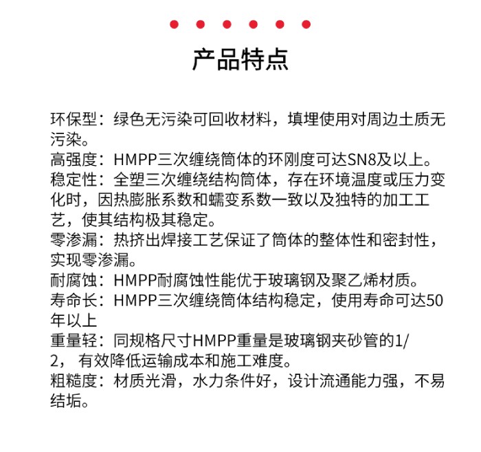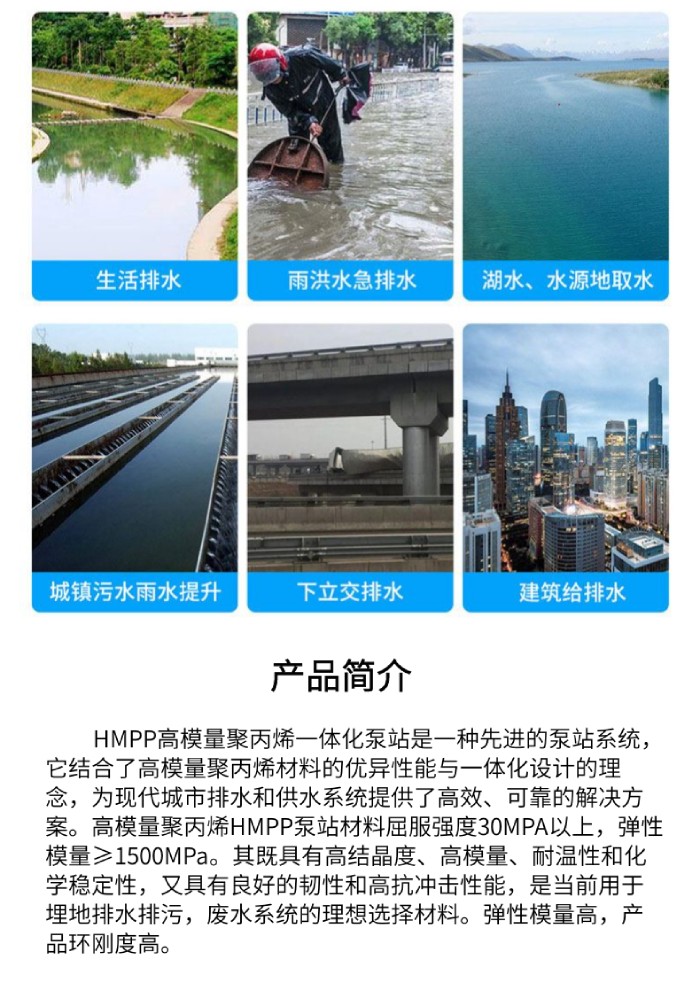 HMPP高模量聚丙烯一體化泵站是一種先進(jìn)的泵站系統(tǒng),它結(jié)合了高模量聚丙烯材料的優(yōu)異性能與一體化設(shè)計的理念,為現(xiàn)代城市排水和供水系統(tǒng)提供了高效、可靠的解決方案。高模量聚丙烯HMPP泵站材料屈服強(qiáng)度30MPA以上,彈性模量>1500MPa。其既具有高結(jié)晶度、高模量、耐溫性和化學(xué)穩(wěn)定性,又具有良好的韌性和高抗沖擊性能,是當(dāng)前用于埋地排水排污,廢水系統(tǒng)的理想選擇材料。彈性模量高,產(chǎn)品環(huán)剛度高。