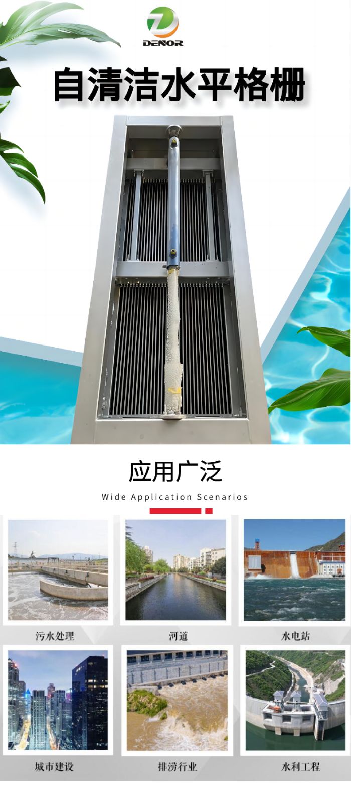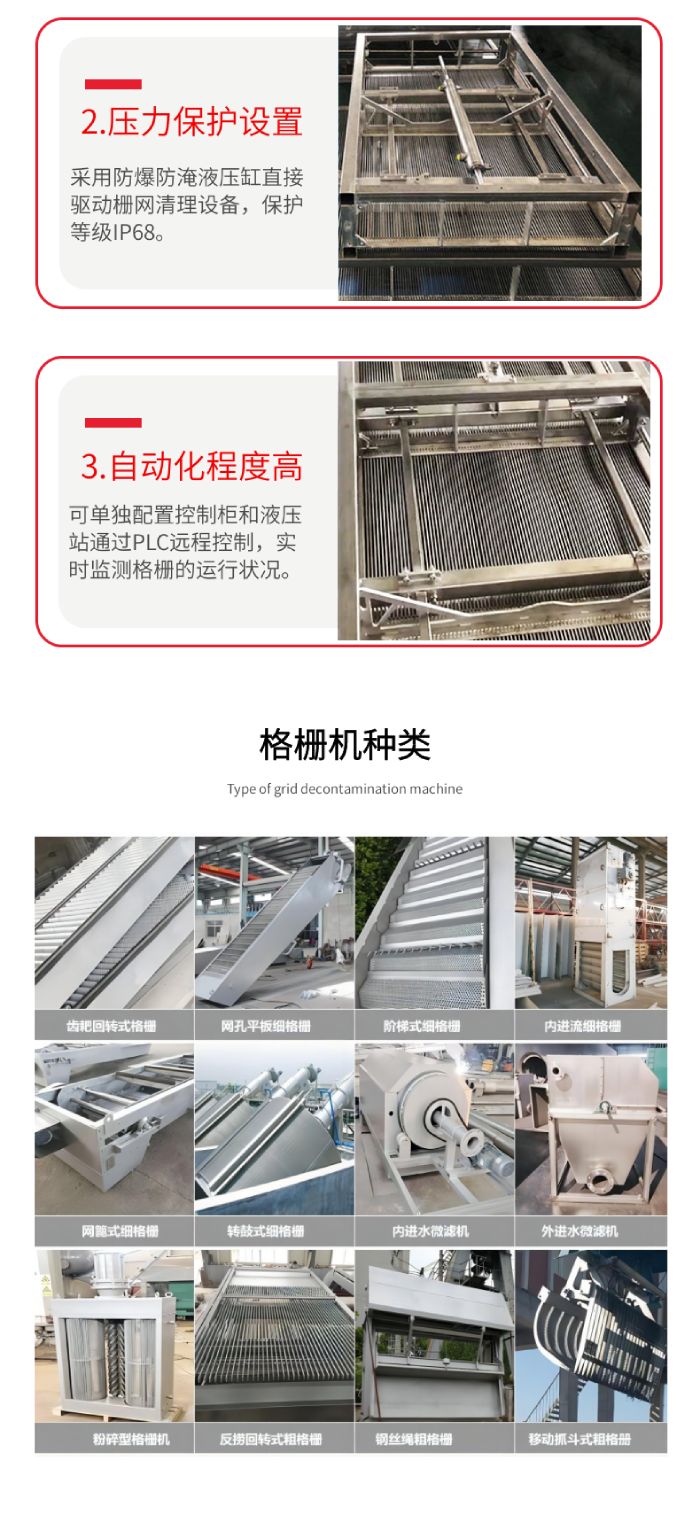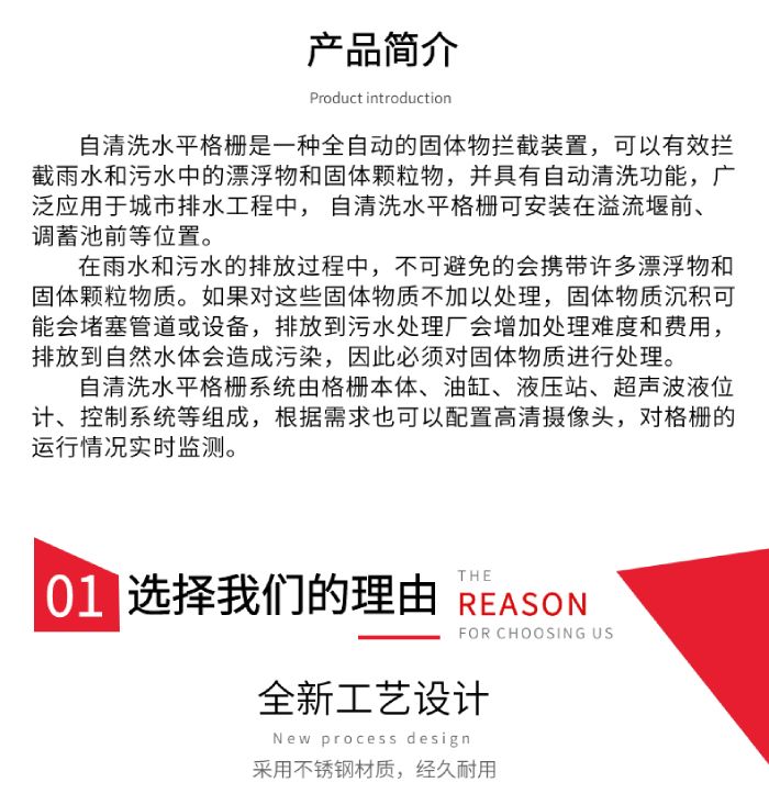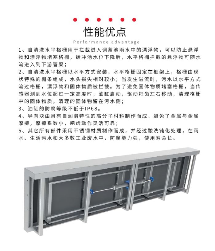 自清洗水平格柵是一種全自動(dòng)的固體物攔截裝置,可以有效攔截雨水和污水中的漂浮物和固體顆粒物,并具有自動(dòng)清洗功能,廣泛應(yīng)用于城市排水工程中, 自清洗水平格柵可安裝在溢流堰前、調(diào)蓄池前等位置。在雨水和污水的排放過程中,不可避免的會攜帶許多漂浮物和固體顆粒物質(zhì)。如果對這些固體物質(zhì)不加以處理,固體物質(zhì)沉積可能會堵塞管道或設(shè)備,排放到污水處理廠會增加處理難度和費(fèi)用,排放到自然水體會造成污染,因此必須對固體物質(zhì)進(jìn)行處理。自清洗水平格柵系統(tǒng)由格柵本體、油缸、液壓站、超聲波液位計(jì)、控制系統(tǒng)等組成,根據(jù)需求也可以配置高清攝像頭,對格柵的運(yùn)行情況實(shí)時(shí)監(jiān)測。
