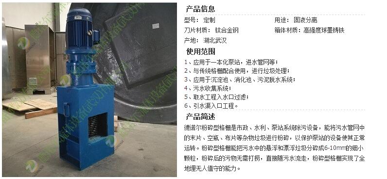 主體設備的安裝粉碎型格柵一般為整體設備,安裝時一般只需進行吊裝及電氣接線。安裝后,必須檢查設備底部是否有渠道底緊密結(jié)合,無傾斜;設備兩側(cè)是否與導軌結(jié)合牢固,無晃動。而且必須注意設備與迎水面垂直,保證大的過水面,同時也保證均勻分布刀片組及轉(zhuǎn)鼓的負荷。電氣接線完成后,須進行試機,保證運行平穩(wěn),刀片組及轉(zhuǎn)鼓轉(zhuǎn)向正確。 粉碎型格柵運行使用注意事項經(jīng)過對幾十個地埋式泵站的跟蹤調(diào)查,發(fā)現(xiàn)部分粉碎型格柵連續(xù)運行7年多未出現(xiàn)故障,而也有部分格柵運行1、2年甚至更短的時候就出現(xiàn)嚴重故障。由于污水的水質(zhì)及水中的雜物種類繁多,運行工況條件相差很大,從而出現(xiàn)的故障及故障頻率也不盡相同。粉碎型格柵運行中出現(xiàn)的常見問題主要有: